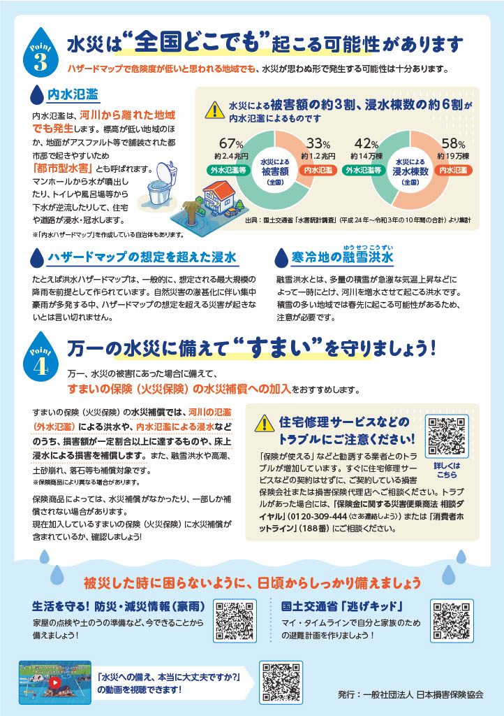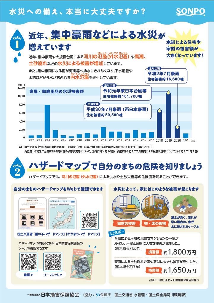 火災保険をご契約いただく際、水災補償を外すことをご検討されることがあるかと思いますが、水災は河川の近くだけで発生するとは限りません。昨今のゲリラ豪雨などで内水氾濫による水災被害も増えています。ハザードマップ等を確認し、慎重にご判断いただきますようお願いします。